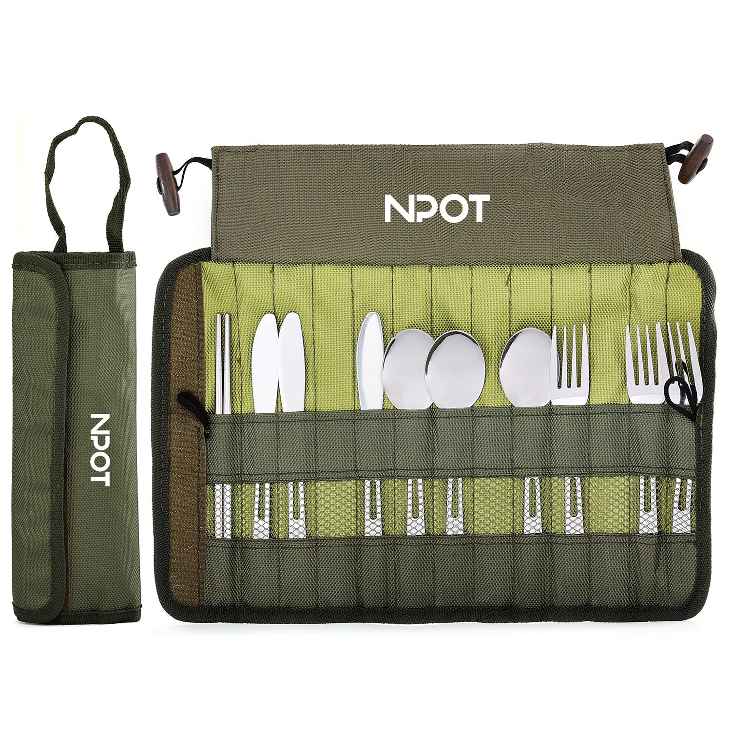NPOT 13-piece camping cutlery organizer set designed for storing and transporting essential dining utensils in outdoor environments. The overall design focuses on portability and efficient organization, making it suitable for camping, picnics, RV trips, and other outdoor or travel scenarios.